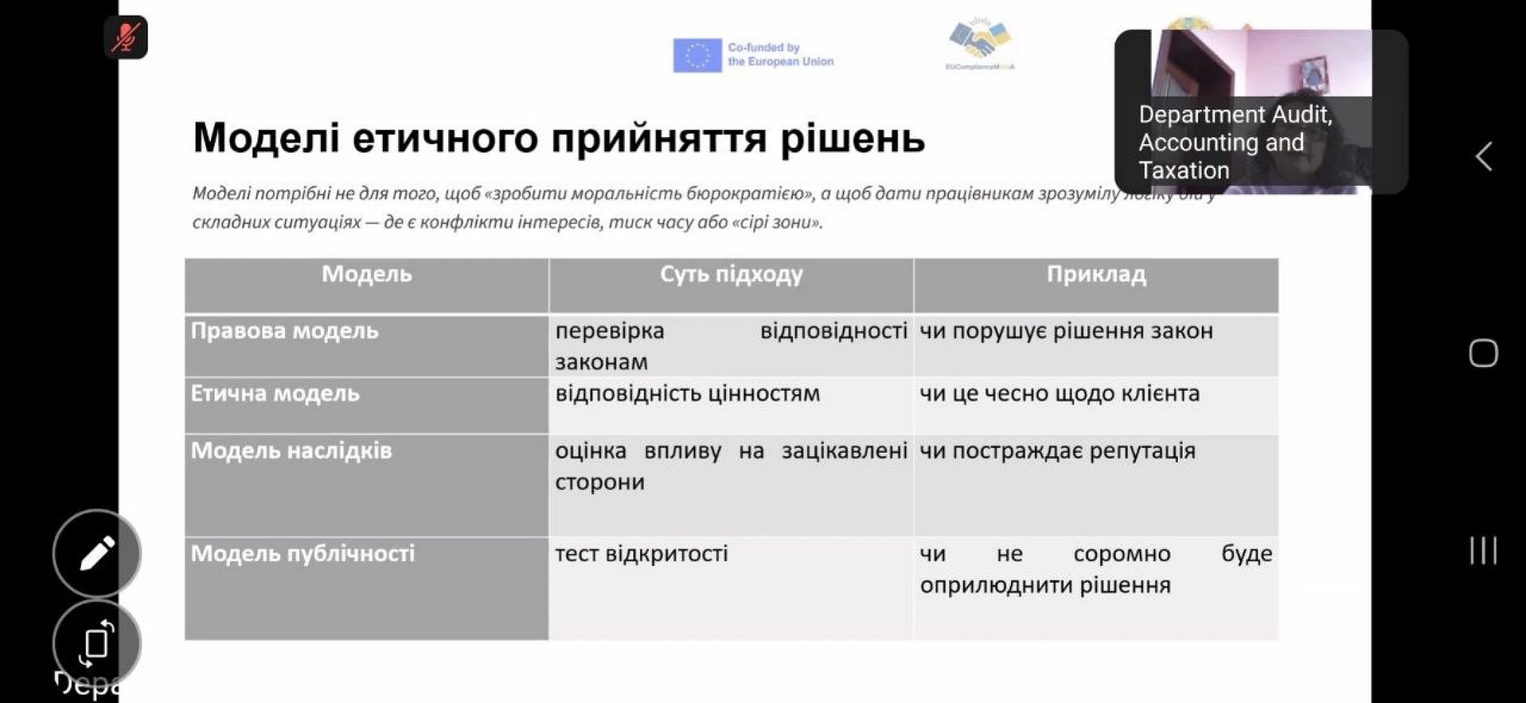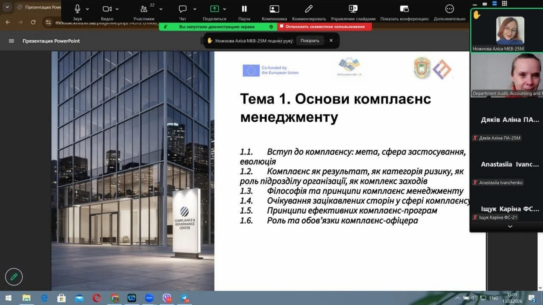 Кафедра щиро пишається тим, що наші магістри долучаються до вивчення сучасного й надзвичайно актуального курсу «Комплаєнс-менеджмент», який реалізується в межах міжнародного проєкту Erasmus+ EUComplianceM4UA. Це не просто навчальна дисципліна, а важливий крок до формування нової генерації фахівців, які володіють європейськими підходами до етики бізнесу, управління ризиками та дотримання регуляторних стандартів. Особливо цінним є те, що курс поєднує теоретичні знання з практичними кейсами, цифровими інструментами та міжнародним досвідом.